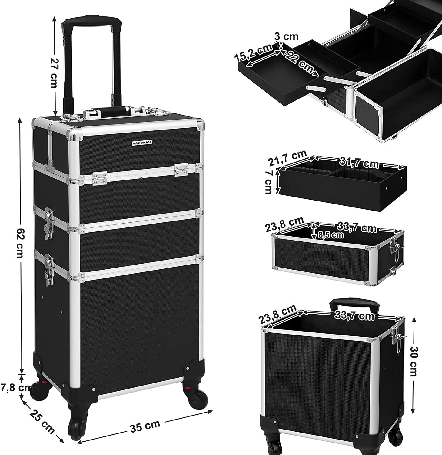 De trolley bestaat uit meerdere uittrekbare vakken perfect voor het opbergen van zowel kleine als grote spullen. De ruime bak onderin biedt ruimte voor grote items zoals een haardroger, nagel lamp of stijltang. Daarbij is de koffer gemaakt van spaanplaat en aluminium voor optimale bescherming van je waardevolle inhoud en kan daarom goed tegen een stootje. Daarnaast is elk niveau voorzien van slot met bijgeleverde sleutels en heeft de trolley een formaat van 68.5 x 35 x 25 cm.