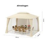 Breng sfeer en comfort in je tuin met het Cape May paviljoen van Trend24. Met een royale afmeting van 400 x 300 x 270 cm biedt dit moderne paviljoen volop ruimte voor ontspanning en samenzijn. De elegante beige kleur geeft het geheel een warme, neutrale uitstraling die bij vrijwel iedere tuin past. Dankzij het ritssysteem zet je het dak eenvoudig vast, ideaal voor snel opbouwen of afbreken bij wisselvallig weer. Het hoogwaardige 420D Oxford doek is volledig waterdicht en biedt uitstekende bescherming tegen de zon. De zijwanden zijn flexibel te openen of sluiten, en het inbegrepen insectennet houdt muggen en vliegen effectief buiten de deur.