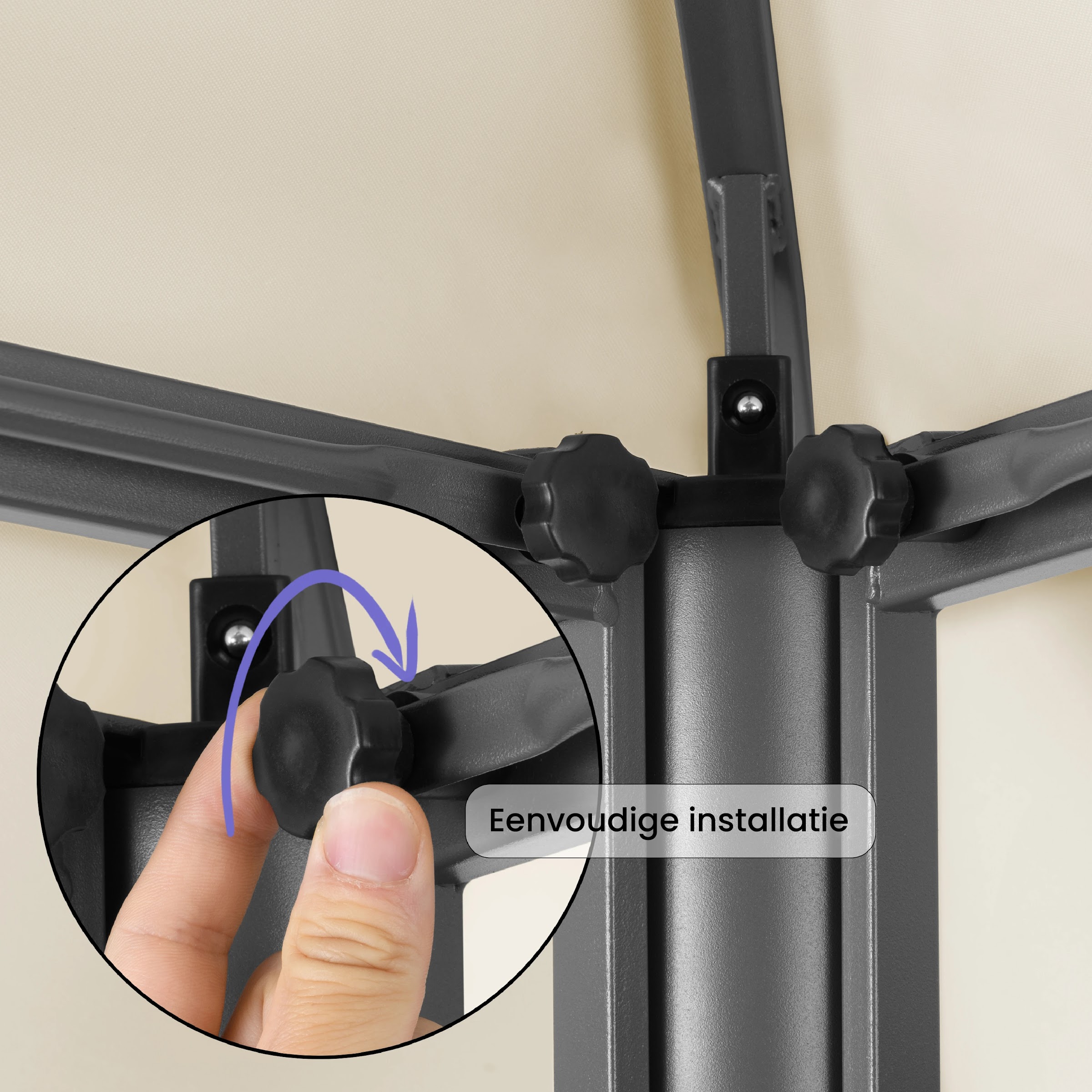 De opbouw is gemakkelijk te volgen dankzij de Nederlandstalige en Engelstalige handleiding met slechts 14 overzichtelijke stappen. Het ritssysteem helpt schade aan het doek te voorkomen en maakt montage of demontage zeer eenvoudig. De bijgeleverde haringen zorgen voor extra verankering via openingen in de poten, waardoor het paviljoen stevig staat – ook bij wind. Montage wordt aangeraden met minimaal 2 personen vanwege de omvang.